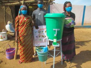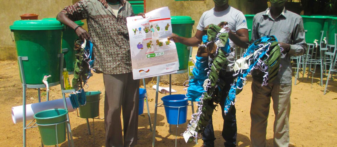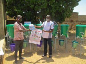 05 CSPS, 03 mairies, 06 marchés locaux, 03 centres communautaires, 02 églises 02 mosquées, 12 coopératives accompagnés de dispositifs de lave-mains, de solution hydro-alcoolisée, de pains de savon, des masques de protection dans le cadre de la lutte contre le covid 19
